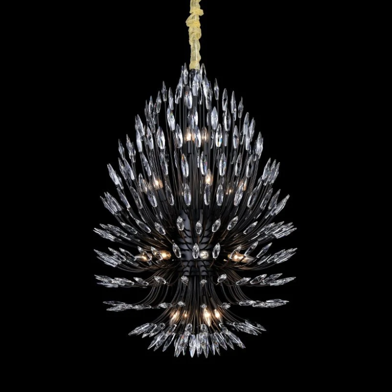 The body of this chandelier is made of metal and high quality crystal, which is treated with multiple processes for saturated color and durability. The lamp posts and iron arms are designed in classic black for elegance and style. Each iron arm is topped with crystals made in the shape of a leaf, which refracts the light passing through with a stunning light. It overall looks like the shape of a bouquet of flowers, and it is absolutely stunning whether the light is turned on or not. Suitable for installation in living rooms, dining rooms, cafes, etc.