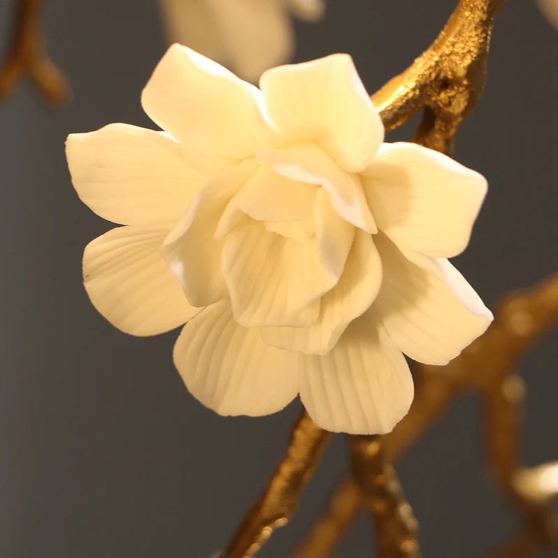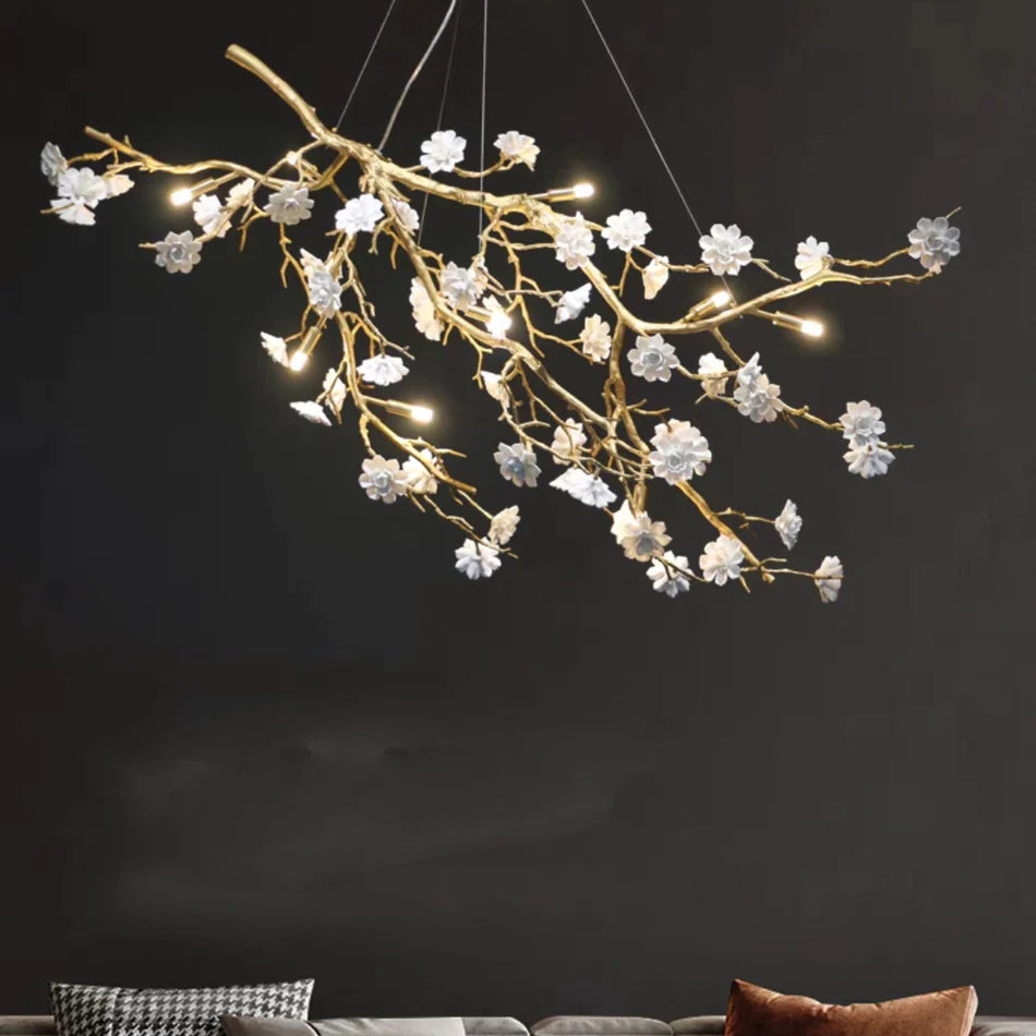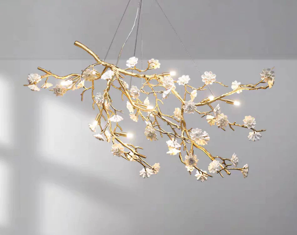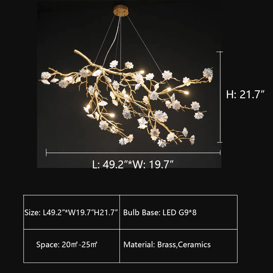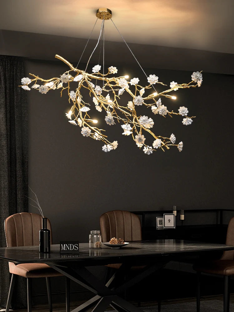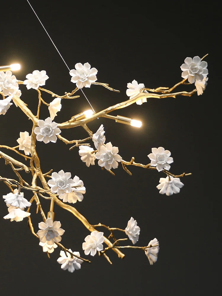 This artistic chandelier is made of brass and ceramic materials. Its shape is full of creativity and novelty. The branches made of brass material have a delicate texture and the simulated branches have many blooming plum blossoms. The white flowers are made of ceramic, flawlessly white, full of fairy-tale romance, exquisite and elegant. This lamp not only has a chandelier can be used in the dining room, living room, bedroom and other places, can definitely make your guests shine.