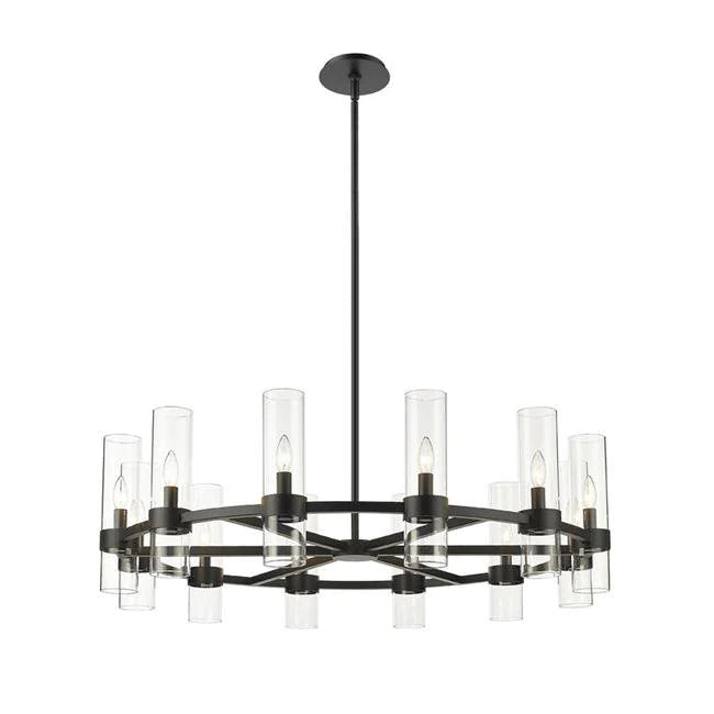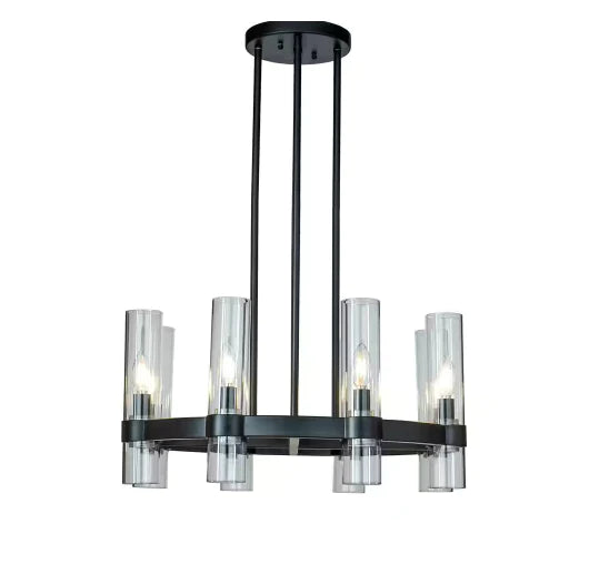 Light up your space with this contemporary Modern Round Wagon Wheel Black Chandelier with Glass Shade. Its classic matt black finish wheel metal frame and clear cylinder hand-blown explosion-proof glass shade help create a modern, minimalistic aesthetic. The 8x E12 candle bulbs provide ample lighting for a variety of usage scenarios, from the dinner table to the bedroom. Brighten up any space today!