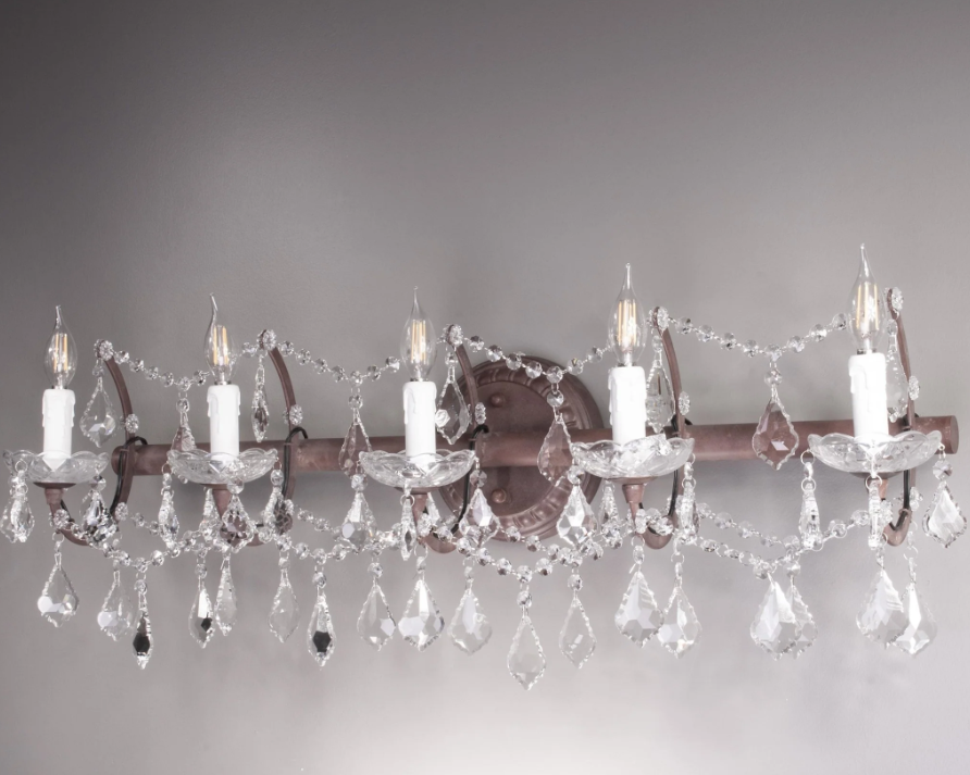 This wall lamp is made of crystal and iron. It is characterized by its classic design, with 3 candle or 5 candle chandeliers placed on small crystal saucers and cups, luxurious and sophisticated. A whole wall lamp is installed where it is needed to provide weak lighting, adding to the elegant atmosphere.